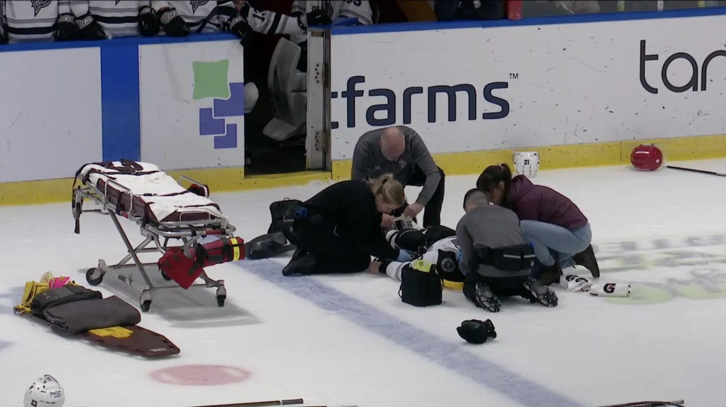 In a horrifying scene, a young defenseman left the ice on a stretcher after a head injury.