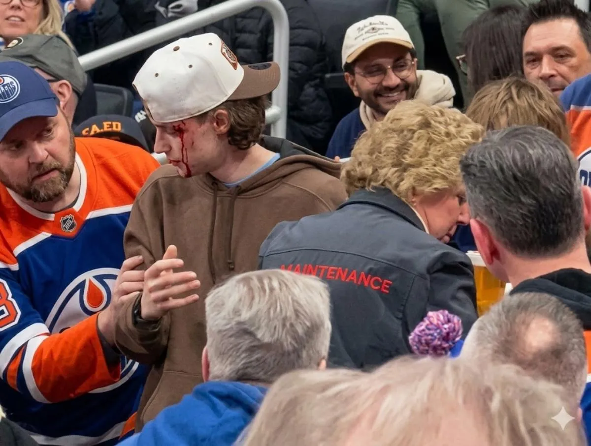 A fan at Rogers Place took a puck in the crowd Saturday night, and the clip turned a loud Edmonton game into a hard jolt of reality.