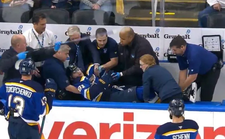 Even though the Blues ended up winning the game 3-2, they had to watch one of their players leave the game during the first period after a wild incident.