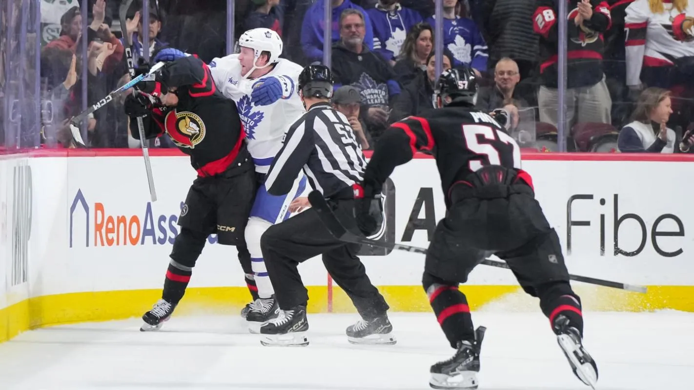 In the final moments of the Battle of Ontario, Toronto Maple Leafs defenseman Morgan Rielly was ejected for a cross check to Ottawa Senators forward Ridly Greig's head which resulted in the NHL to take action.