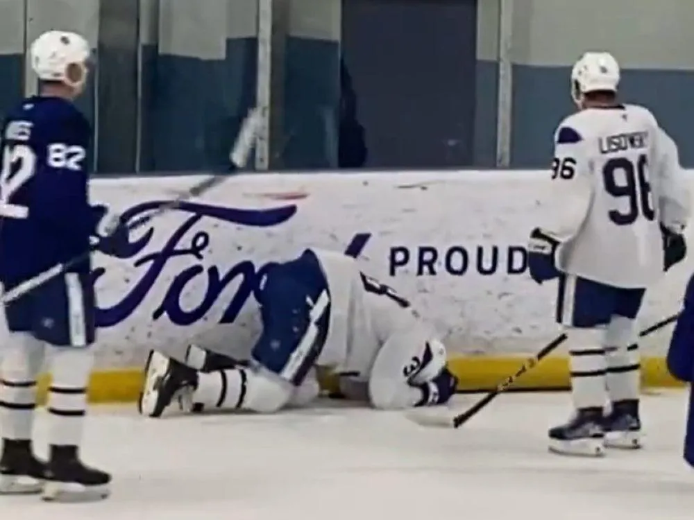 Maple Leafs' Ben Danford leaves practice after awkward hit