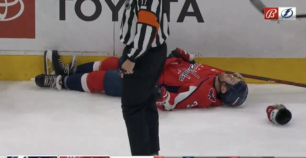 Washington's Nick Jensen had to leave the game on a stretcher after receiving a hit from Tampa Bay's Michael Eyssimont.