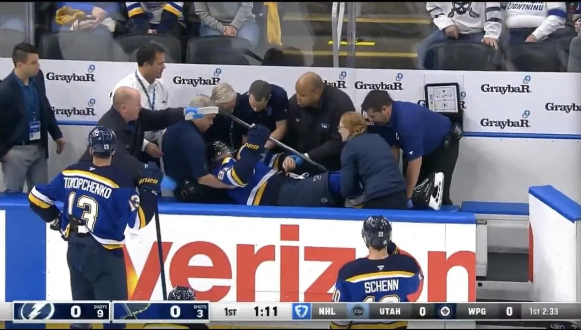 Tonight reports have come in confirming that St. Louis Blues forward Dylan Holloway has been taken off of the ice on a stretcher after suffering an upper-body injury.