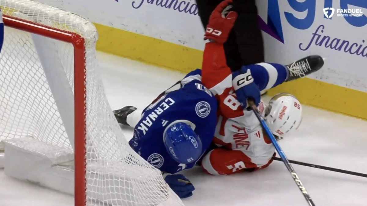 That was the image that stuck. Not some clean skill play, not a late push, but a messy crease sequence with Cernak landing on top of Finnie in a game the Lightning already seemed to control.