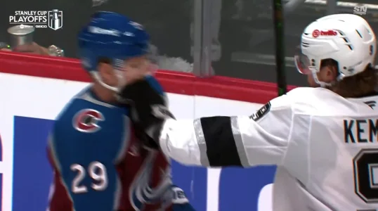 Kempe reaches out and catches MacKinnon high in the face area with his glove after the whistle, the kind of little extra that tells you this series is already getting nasty.