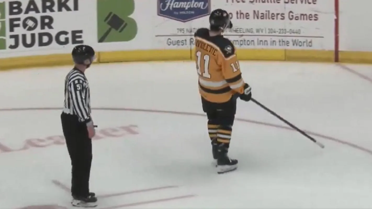 Peter Laviolette, son of the New York Rangers head coach, won't be making any friends with the refs after this display as he left the ice. Lavy III plays for the ECHL's Wheeling Nailers