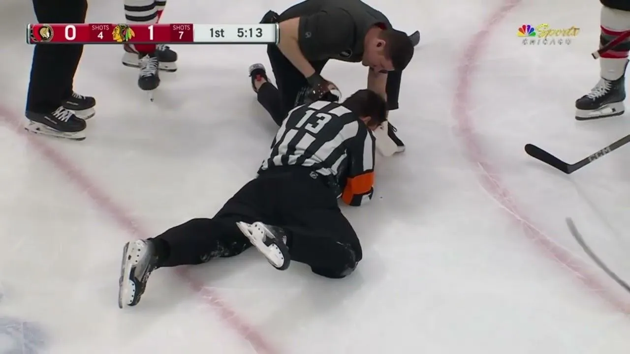 Blackhawks winger Boris Katchouk attempted a short side shot on net, but missed completely. Unfortunately, the puck struck referee Furman South directly in the face, causing him to bleed on the ice.